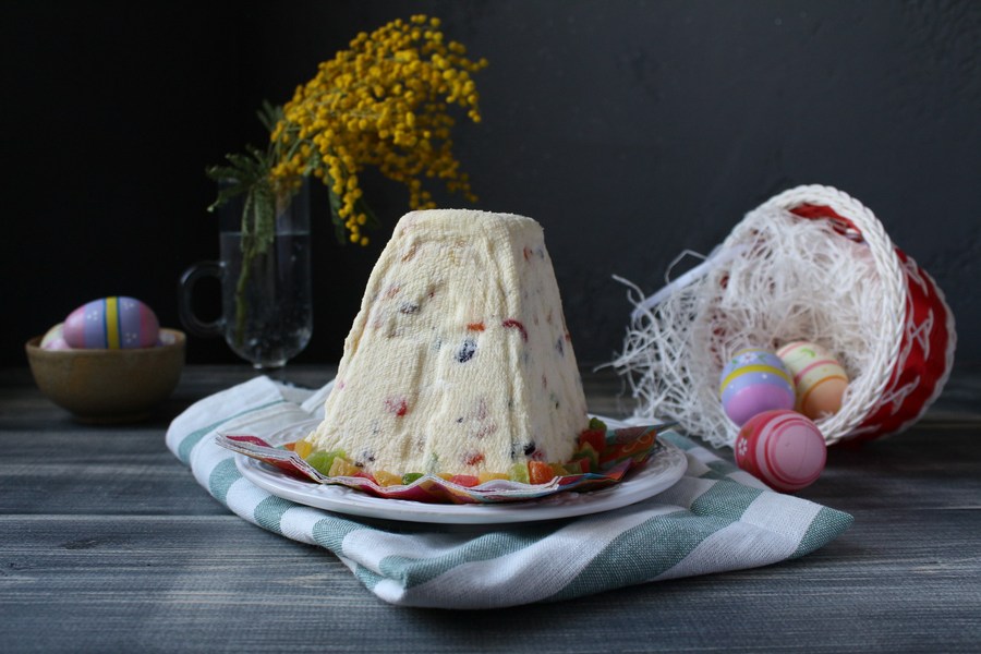 Для "дозревания" паске понадобится 10-12 часов. Затем ее необходимо аккуратно освободить от марли и выложить на блюдо, украсить мармеладом или пасхальными посыпками, или полить шоколадом.