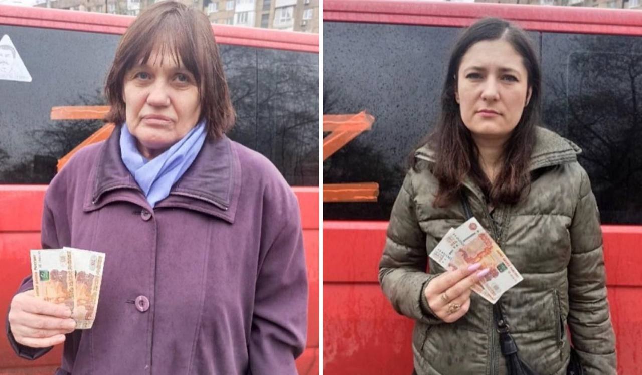 Для всех женщин, получивших две купюры, выбрали одинаковую "фотозону" - красный автобус с рашисткой свастикой. В комментариях заметили, что ни у одной из них нет скорби на лице.