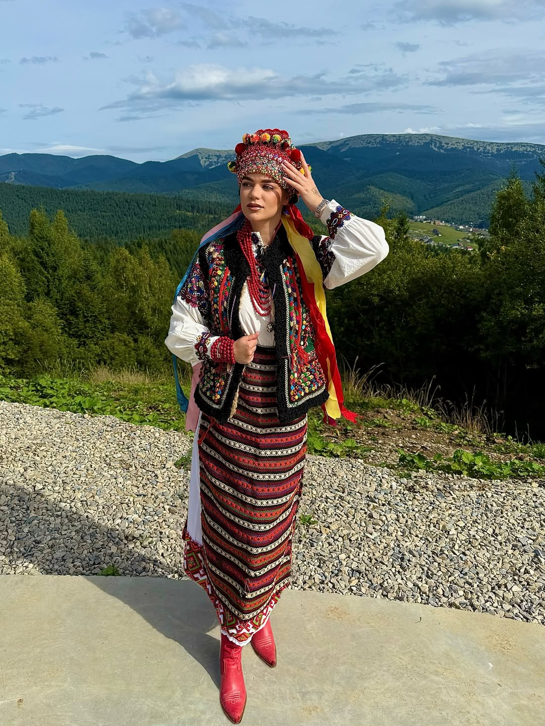 Галина оделась в расшитую рубашку ручной работы с орнаментами, красочный кептар, украшенный вышивкой, и широкий пояс с карпатскими мотивами. Ожерелья и браслеты, венок из тканых цветов и яркие ленты стали красивым дополнением образа.