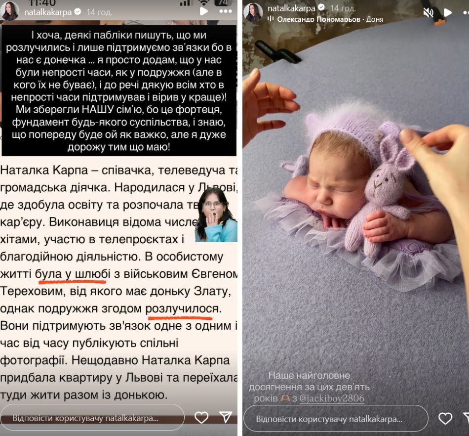 В "сториз" Наталка опровергла слухи о разводе и прокомментировала упреки, будто они с мужем остаются вместе только ради дочери Златы, которую певица называет "наибольшим достижением за эти девять лет" .