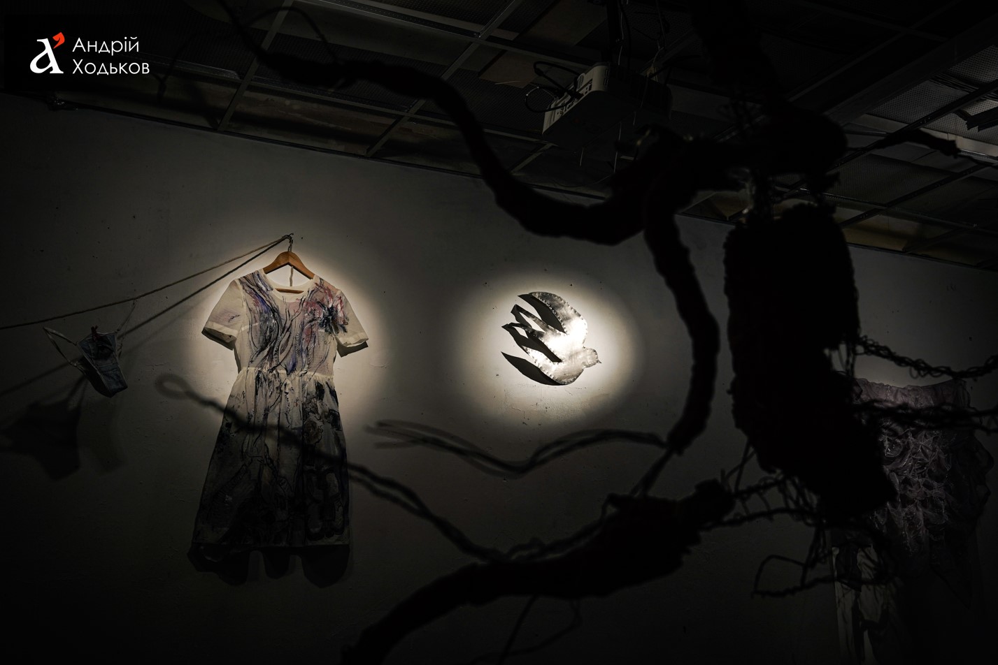 Сразу при входе в пространство можно увидеть на полу кучу птичек , которые сделаны из алюминиевых банок из-под разных напитков. Художница рассказала, что хотела, чтобы посетители могли взаимодействовать с пространством через звук, который издают эти металлические птички, ведь наступая на них слышен шум шороха, как определенного символа общения.