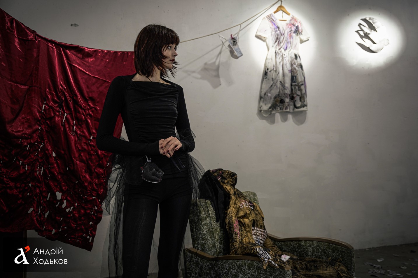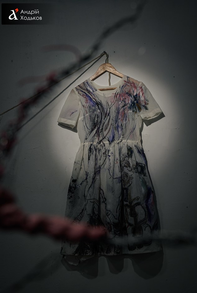 Некоторые работы имеют персонализированный подтекст. "Для меня личное значение имеет работа с платьем - на ней изображены определенные воспоминания из моей поездки и пережитые воспоминания войны. Этим платьем я хотела показать события, которых уже не стало, показать протяженность времени" , - рассказывает она.