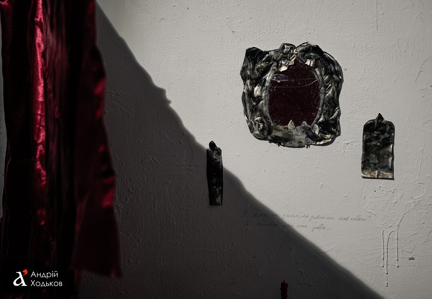 Отдельное место в пространстве занимает триптих, скрытый за шторой. "Я хочу, чтобы люди заходили под штору и погружались в это пространство — в диалог между людьми, который напоминает разрастающиеся корни, но мы не знаем, пришли ли эти мысли друг к другу. Это о недоразумении, когда пытаешься донести мысль, а человек интерпретирует ее по-другому" , — делится Милана.