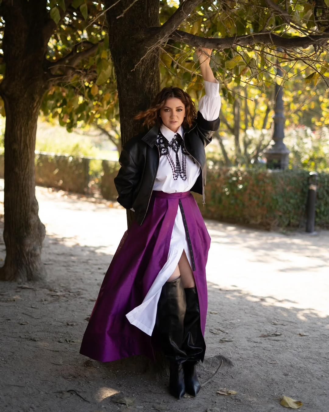 Цибульская оделась в пышную фиолетовую юбку, кожаный жакет и черные ботфорды на каблуке. Меткое дополнение - массивное ожерелье, напоминающее традиционные украинские корали.