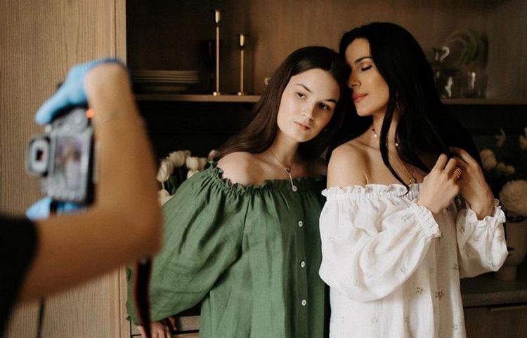 Для фотосессии телеведущая надела легкое льняное платье белого цвета с объемными рукавами и оголенными плечами. Нана нарядилась в похожий наряд зеленого цвета.