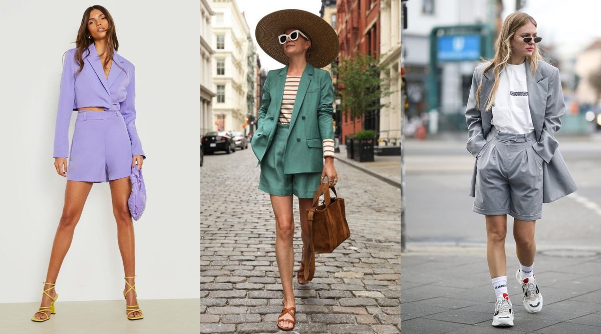 Еще один стильный вариант – женский костюм с укороченным жакетом. Выбирайте яркие оттенки на лето: лиловый, голубой, салатовый. А дополнят такой костюм с шортами босоножки контрастного цвета и оригинальная сумка.