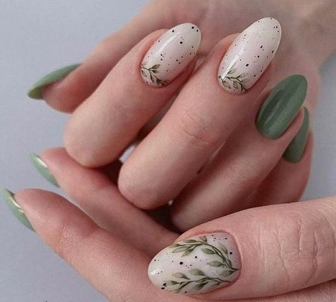 Також навесні популярний манікюр у зелених відтінках. Ви можете поєднувати цей колір з білими і бежевими, а також додати акцентів за допомогою трендового дизайну "в крапочку".