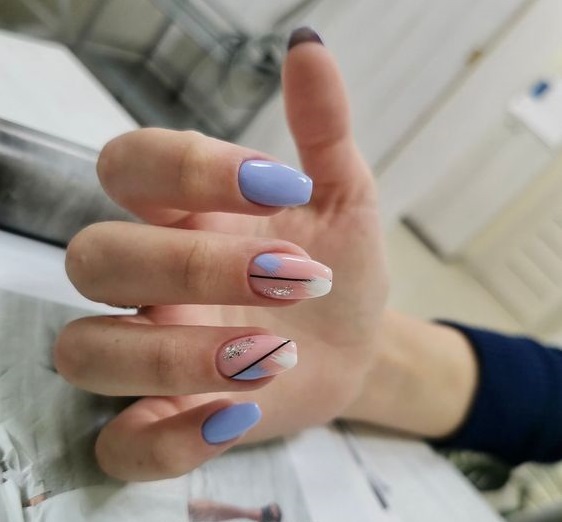 Також навесні популярні блакитні та бузкові кольори лаку для нігтів. Ви можете поєднувати такий колір з прозорим покриттям, на якому можна зробити незвичний дизайн - чіткі геометричні лінії та хаотичні мазки.