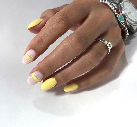 Ще один стильний варіант - у жовтому кольорі. Ви можете урізноманітнити такий манікюр геометричними смугами контрастного кольору або поєднувати його з сірим або білим кольорами.