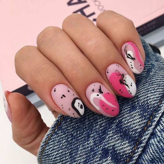 Ще один варіант - абстракція на нігтях. Покрийте їх напівпрозорим кольором, а потім починайте творити за допомогою хаотичних мазків яскравого відтінку і чорних крапок.