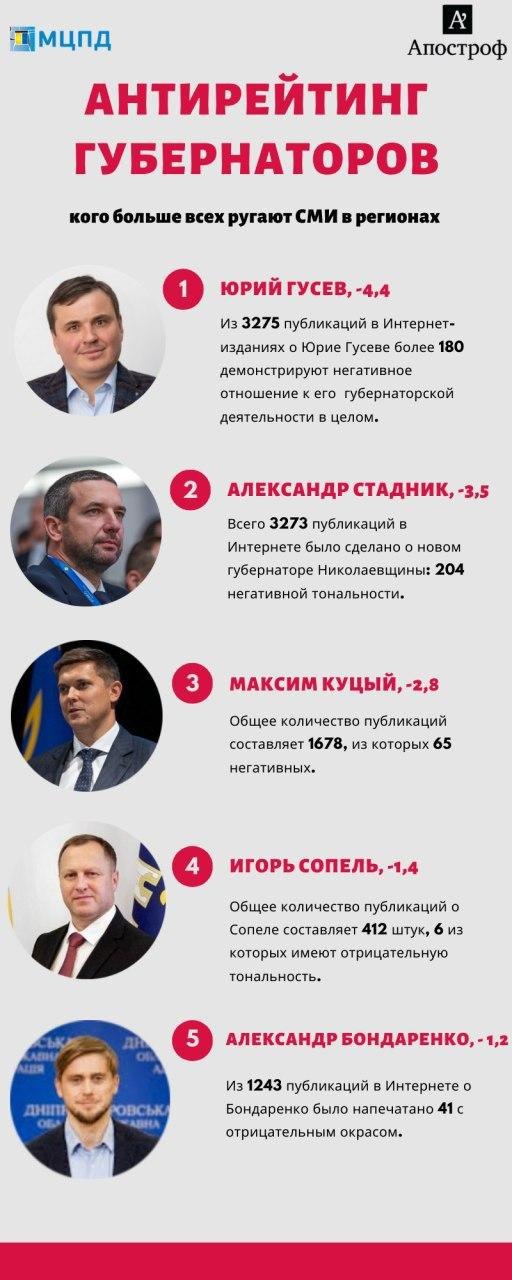 Відзначимо, що переважна більшість голів ОДА, включених в "Рейтинг", має серйозні проблеми з комунікацією. Часто їх дії просто не знаходять розуміння в місцевих ЗМІ. А іноді преса їх в буквальному сенсі "медійно знищує". В результаті в Індексі медіа-сприйняття вони отримують не просто низькі позитивні, але негативні бали (сам Індекс розраховується як середнє значення різниці між відсотком позитивних та негативних публікацій у місцевих ЗМІ про персону голови ОДА, - ред.). ТОП-5 таких губернаторів ми вирішили об'єднати в своєрідний антирейтинг.