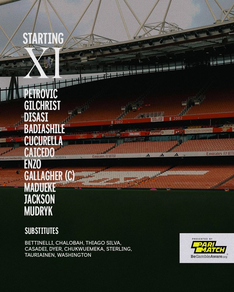 Челсі: 28. Джордже Петрович - 3. Марк Кукурелья, 5. Бенуа Бадьяшиль, 2. Аксель Дісасі, 42. Алфі Гілхріст - 8. Енцо Фернандес, 25. Мойзес Кайседо - 10. Михайло Мудрик, 23. Конор Галлахер (c), 11. Ноні Мадуеке - 15. Ніколя Джексон