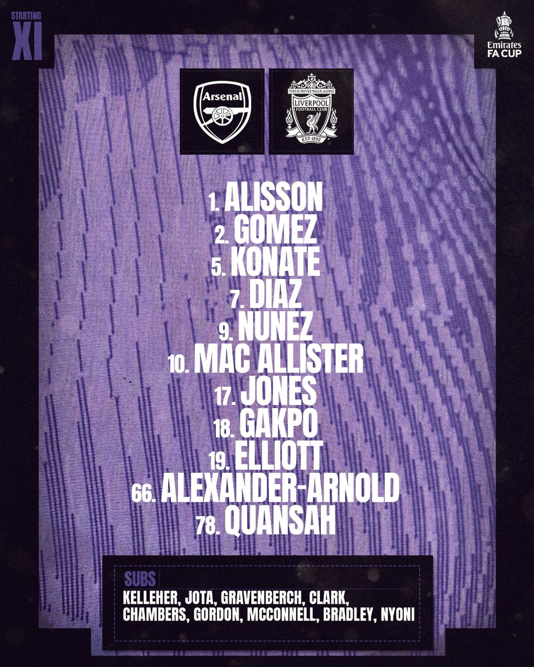 Ліверпуль: 1. Алісон – 2. Джо Гомес, 78. Джарелл Аморін Кванса, 5. Ібраїма Конате, 66. Трент Александер-Арнольд – 17. Кертіс Джонс, 10. Алексіс Мак Аллістер, 19. Гарві Елліотт – 7. Луїс Діас. 9. Дарвін Нуньєс, 18. Коді Гакпо