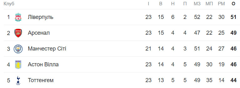 "Ліверпуль" все ще лідирує в АПЛ. Але "Арсенал" скоротив відставання до двох очок. До того ж, "канонірам" у спину дихають "Манчестер Сіті" та "Астон Вілла".