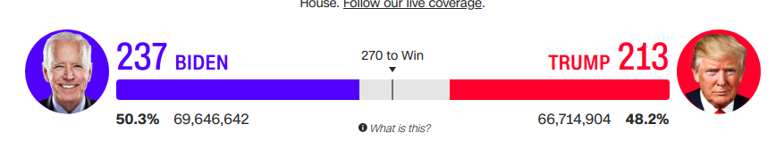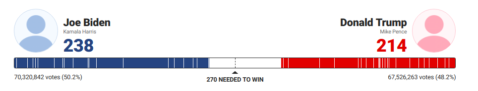 09:35 Відрив між кандидатами скорочується. Так, Байден отримав 238 голосів виборників. Його підтримали 49,8% американців. Проголосували за його кандидатуру 66,301,989 осіб.
