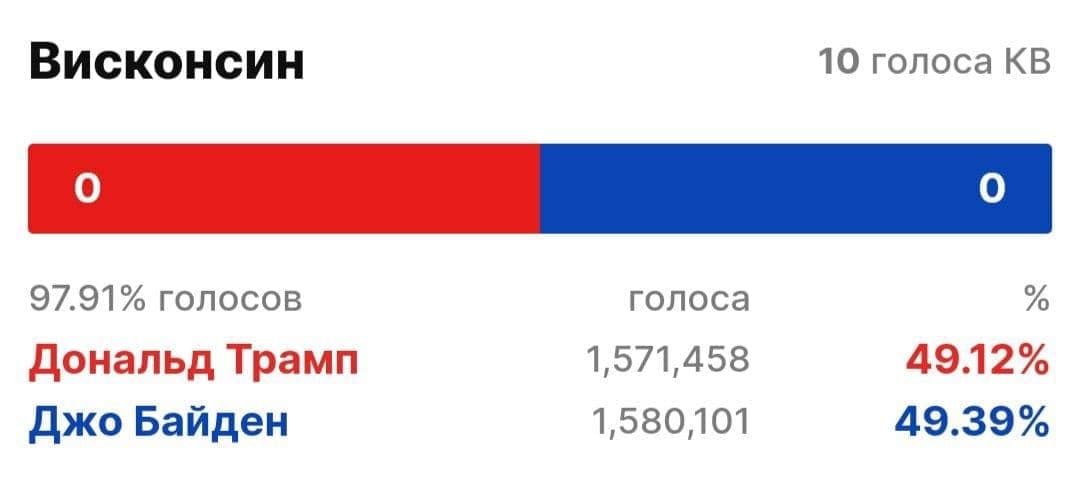 11:20 У ході підрахунку голосів на виборах президента США Вісконсін ... почав йти під Байдена. На 95% оброблених даних у Байдена 49,4%, у Трампа 49,1%.