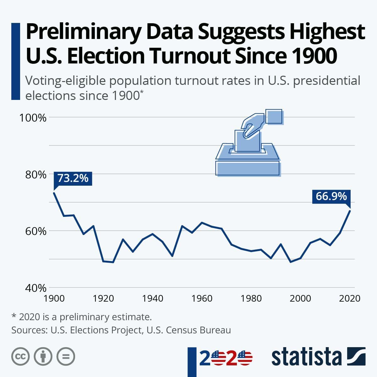 У Трампа зараз - 67 310 009 голосів (48,2%), також більше, ніж він отримав в 2016 році, і більше, ніж Обама в 2012 році. З цими голосами Трамп на третьому місці у списку за всю історію США.