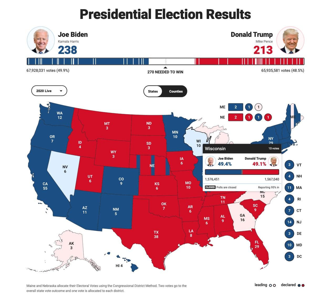 15:34 Після підрахунку 99% голосів у штаті Вісконсін кандидат від Демократичної партії Джо Байден отримав невелику перевагу (близько 20 тисяч голосів) над чинним президентом Дональдом Трампом.