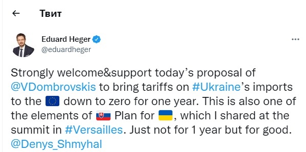"Щиро підтримую пропозицію Валдіса Домбровскіса (європейського комісара з питань торгівлі - "Апостроф") про зниження до нуля митних тарифів для імпорту з України на рік. Це було одним з пунктів словацького плану для України, який я представив на саміті в Версалі. Але не на рік, а назавжди", - написав він в Twitter.