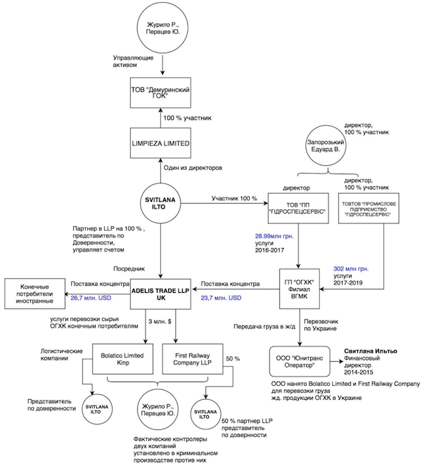 Компанії "Юнітранс Оператор", First Railway Company LLP та Bolatico Limited надавали послуги з перевезення сировини ОГХК кінцевим споживачам у цій схемі, а Adelis Trade LLP – була посередником між ОГХК та кінцевими набувачами сировини. З лютого 2015 року "Юнітранс Оператор" стало монополістом залізничних перевезень ОГХК, вигравши тендери лише на один рік на суму 425,97 млн. грн. За адресою реєстрації "Юнітранс Оператор" до 2015 р. знаходився офіс ДП ОГХК.
