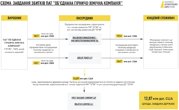 Насамперед, варто зазначити, що саме вона була серед фігурантів розслідування НАБУ, яке виявило злочинні схеми продажу продукції ДП ОГХК її колишніми менеджерами Р. Журило та Ю. Перцевим, внаслідок яких державі було завдано фінансових збитків на суму 300 млн. грн.