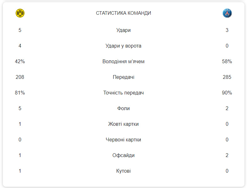 22:57. статистика першої половини гри. У гостей поки немає ударів у площину воріт "Боруссії"