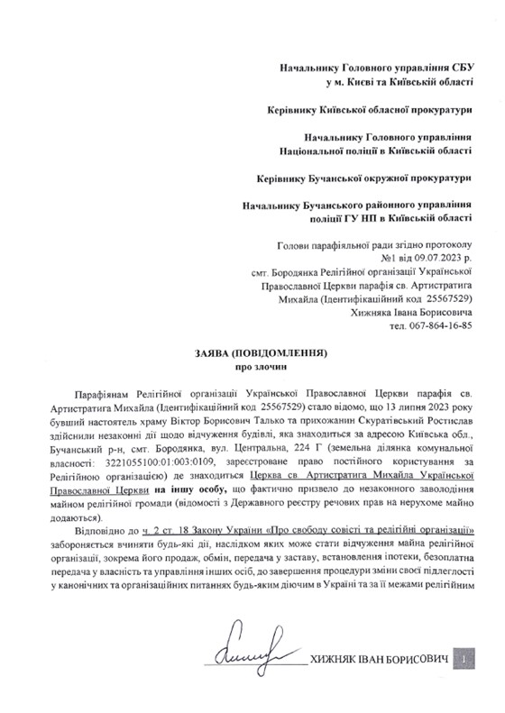 Згідно із заявою, 13 липня священник УПЦ МП Віктор Талько разом із прибічником московської церкви Ростиславом Скуратівським здійснили незаконні дії щодо відчуження будівлі храму на користь ТОВ "Центр духовного розвитку". Цим порушили ч. 2 ст. 18 Закону України "Про свободу совісті та релігійні організації", яка забороняє відчужувати майно релігійних громад до завершення процесу зміни канонічної підлеглості. На думку заявника, в діях Талька та Скуратівського є ознаки злочинів, передбачених статтями 190, 191, 192, 206-2 Кримінального кодексу – це шахрайство, привласнення майна, заподіяння майнової шкоди шляхом обману. Заяву до правоохоронних органів подано 18 липня.