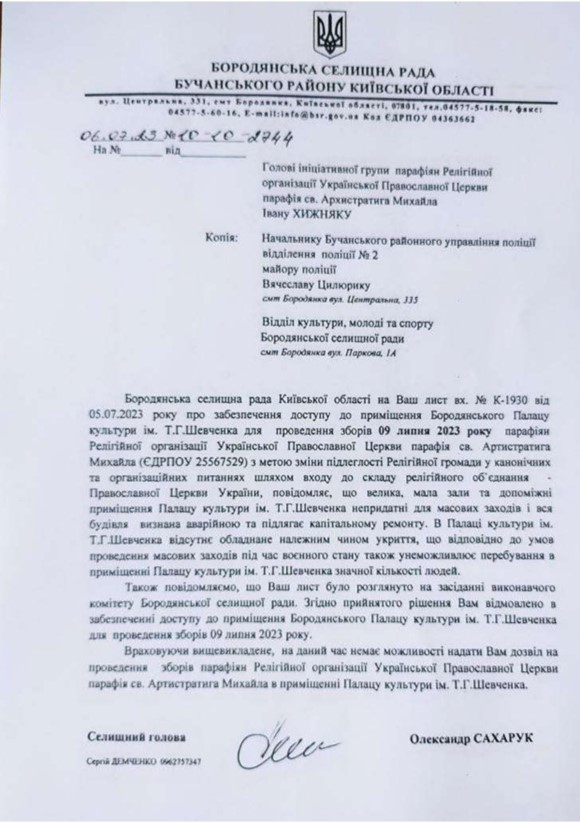 Відмова Бородянського селищного голови Олександра Сахарука дати дозвіл на проведення зборів релігійної громади у Палаці культури Бородянки, 4 липня