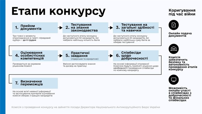 Конкурс має формальних сім етапів, і станом на початок лютого Комісії залишилось реалізувати два останні з них – співбесіди щодо доброчесності та визначення трьох переможців.