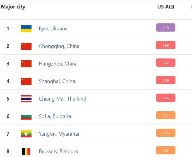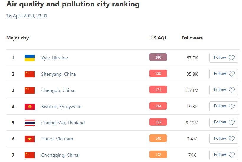 Увечері 16 квітня в києві був зафіксований "червоний" рівень забруднення повітря. За даними сайту iqair.com, рівень склав 380 AQI.