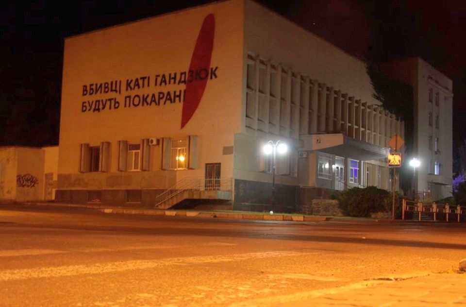 Вбивці Каті Гандзюк будуть покарані. Такий напис з'явився зранку в річницю нападу на активістуку на будівлі Херсонської міськради.