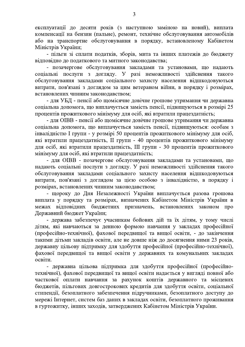 Учасники бойових дій мають право на безплатний проїзд у міському транспорті, автомобільному транспорті в сільській місцевості, залізничному і водному транспорті приміського сполучення, приміському та міжміському автобусному транспорті (це право поширюється і на супроводжуючого особи з інвалідністю I групи).
