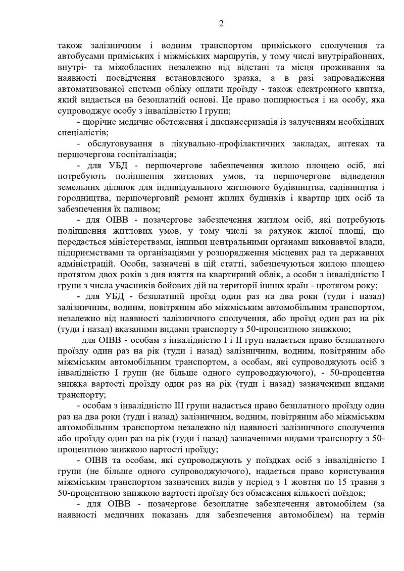 УБД також мають право раз на два роки на безкоштовний проїзд (туди і назад) залізничним, водним, повітряним та міжміським автомобільним транспортом (у разі щорічного використання цієї пільги проїзд буде платним зі знижкою 50%).
