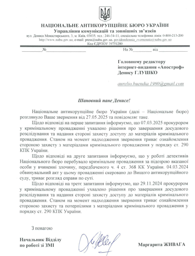 "Станом на момент надходження звернення (27 травня 2025 року – "Апостроф") триває ознайомлення стороною захисту з матеріалами кримінального провадження у порядку ст. 290 КПК України", - повідомили в НАБУ.