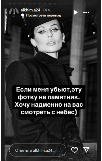 "Якщо мене уб'ють - це фото на пам'ятник. Хочу гордовито на вас дивитися з небес", - написала Алхім.