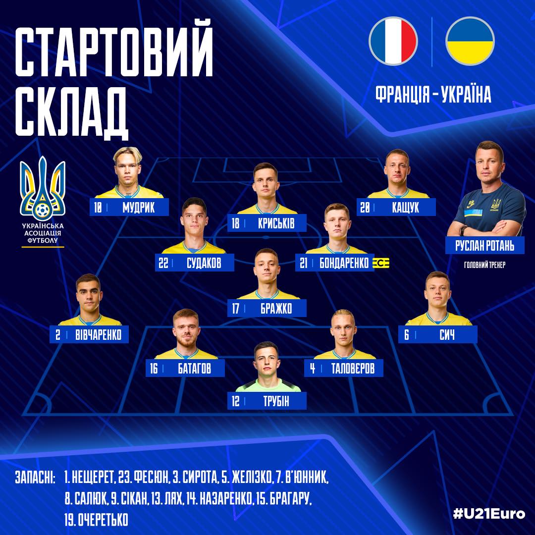 Україна: 12. Анатолій Трубін - 2. Костянтин Вівчаренко, 4. Максим Таловеров, 16. Арсеній Багатов, 6. Олексій Сич - 21. Артем Бондаренко (к), 17. Володимир Бражко - 10. Михайло Мудрик, 22. Георгій Судаков, 20. Олексій Кащук - 18. Дмитро Криськів
