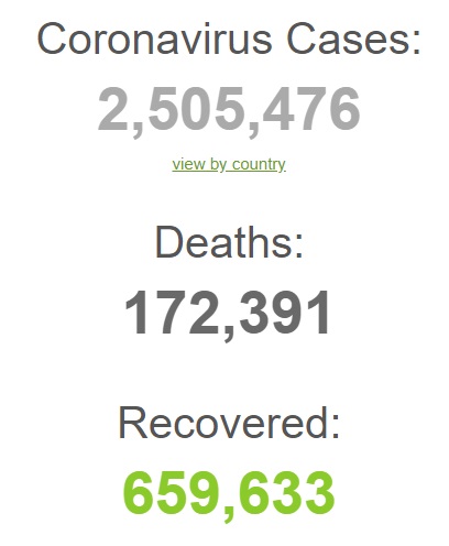 Згідно з даними ресурсу worldometers, станом на 23:00 в світі зафіксовано 2 543 588 випадків зараження на коронавірус. Померло - 176 596. Одужали - 687 034.
