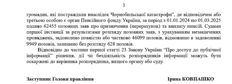 Знову звернемося до інформації, що була надана Пенсійним фондом: "… за період з 1.01.2024 по 1.03.2025 подано 62 455 позовних заяв про призначення (перерахунок) та виплату пенсій. Судами першої інстанції за результатами розгляду позовних заяв, з урахуванням незакінчених проваджень, задоволено повністю або частково 46 099 позовів, відмовлено в задоволенні 9949 позовів, залишено без розгляду 628 позовів".