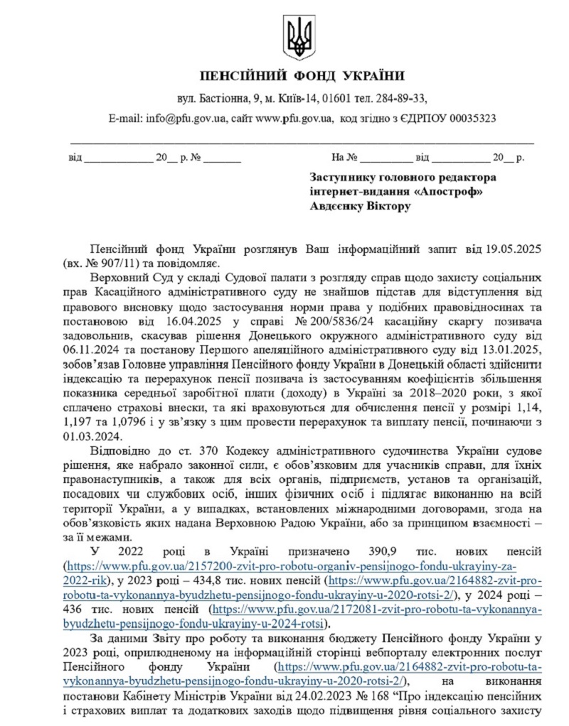 "Відповідно до статті 370 Кодексу адміністративного судочинства України, судове рішення, яке набрало законної сили, є обов"язковим для учасників справи, для їхніх правонаступників, а також для всіх органів, підприємств, установ та організацій, посадових чи службових осіб, інших фізичних осіб, і підлягає виконанню на всій території України, а у випадках, встановлених міжнародними договорами, згода на обов"язковість яких надана Верховною Радою України, або за принципом взаємності – за її межами", - йдеться у відповіді Пенсійного фонду на офіційний запит "Апострофа".