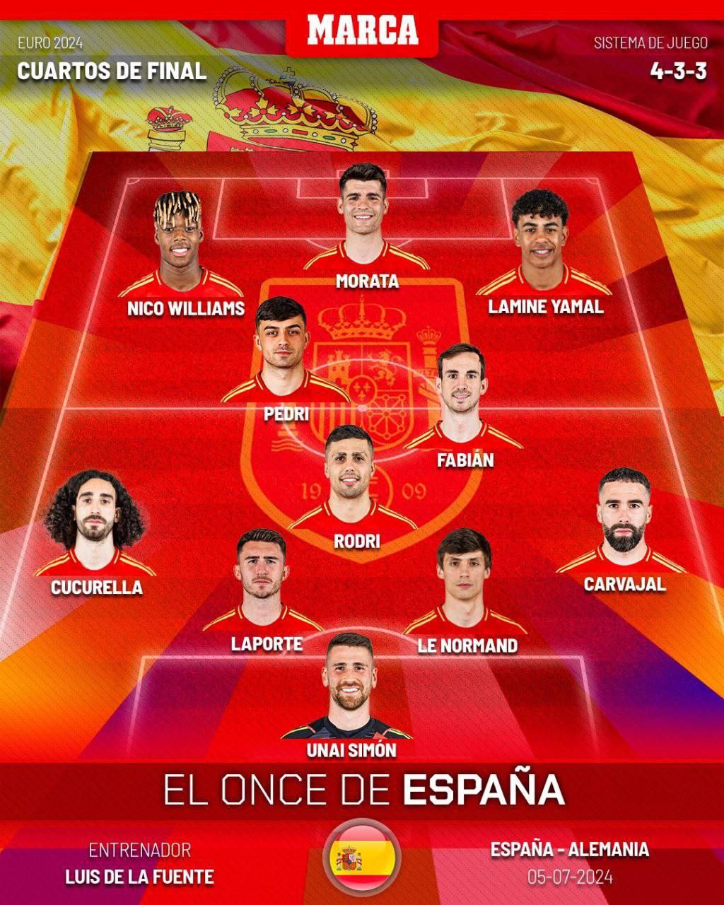 Збірна Іспанії: Сімон (В), Карвахаль, Ле Норман, Ляпорт, Кукурелья, Родрі, Руїс, Ямаль, Педрі, Вільямс, Мората (К).
