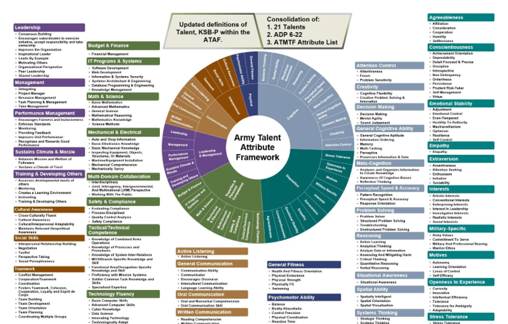 Діаграма знань, вмінь та рис поведінки, які нині оцінюють у військових США, аби виявити таланти. Це трирівнева структура, що складається з 7 секторів талантів (по внутрішньому колу), 43 пов'язаних з ними талантів (по зовнішньому колу) і 195 вимірюваних знань, вмінь та рис поведінки (у переліках). Джерело.