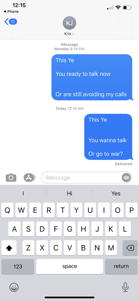 Вест звинуватив Кардаш'ян та її матір у вищості білих, опублікувавши скріншот листування з Дженнер. "Хочеш поговорити, або будемо воювати?" - звернувся до тещі репер, не дочекавшися відповіді на попереднє повідомлення. Також він назвав Дженнер Кріс Чен Ином, натякаючи на її диктаторські замашки.