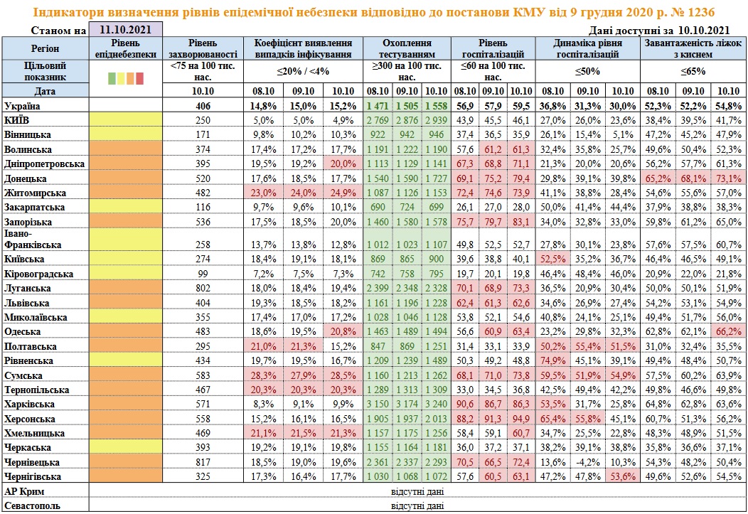 Дещо краще справи у Дніпропетровській, Чернігівській, Донецькій і Хмельницькій областях. У цих регіонах показники перевищені за двома критеріями. У Дніпропетровській і Хмельницькій області надлишок нових випадків і зростання рівня госпіталізацій, в Чернігівській області кепські справи з рівнем і динамікою госпіталізації, а в Донецькому регіоні завантажені ліжка з киснем і перевищено все той же рівень госпіталізацій.