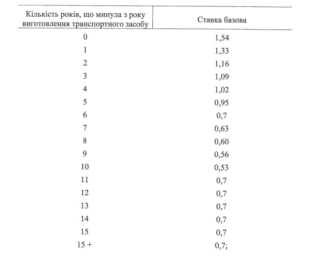 Таблиця значень базової ставки залежно від віку машини наводиться в законопроєкті.
