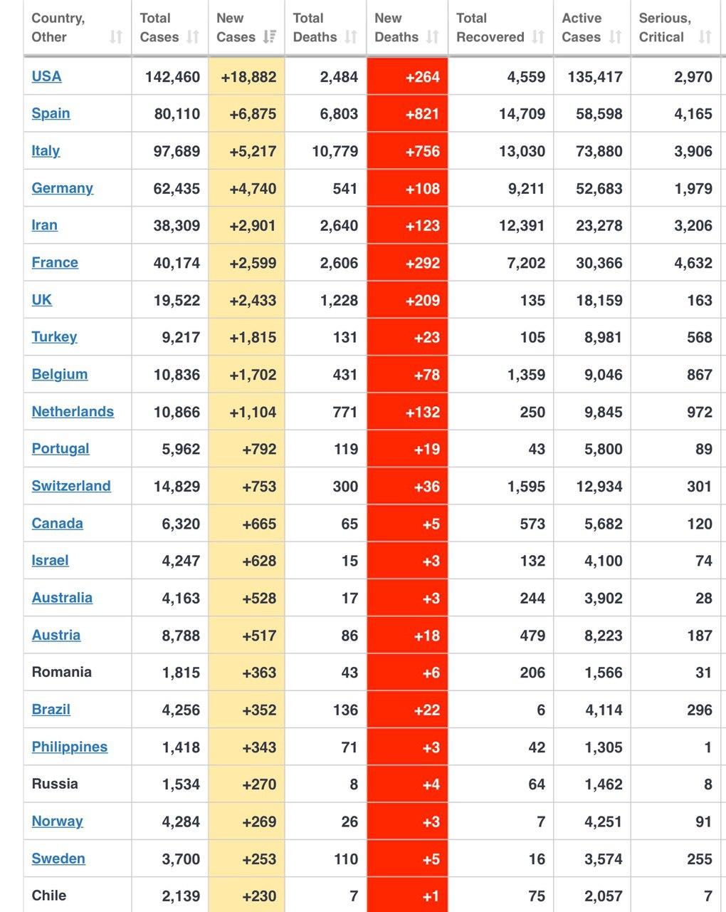 Країнами з найбільш швидким поширенням коронавірусу залишаються США (142 328), Італія (97 689), Іспанія (80 110), Німеччина (62 095), Франція (40 723) та Іран (38 309).