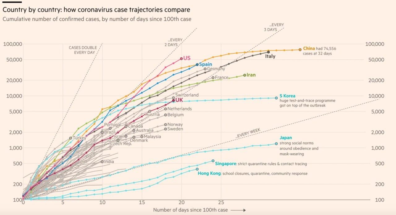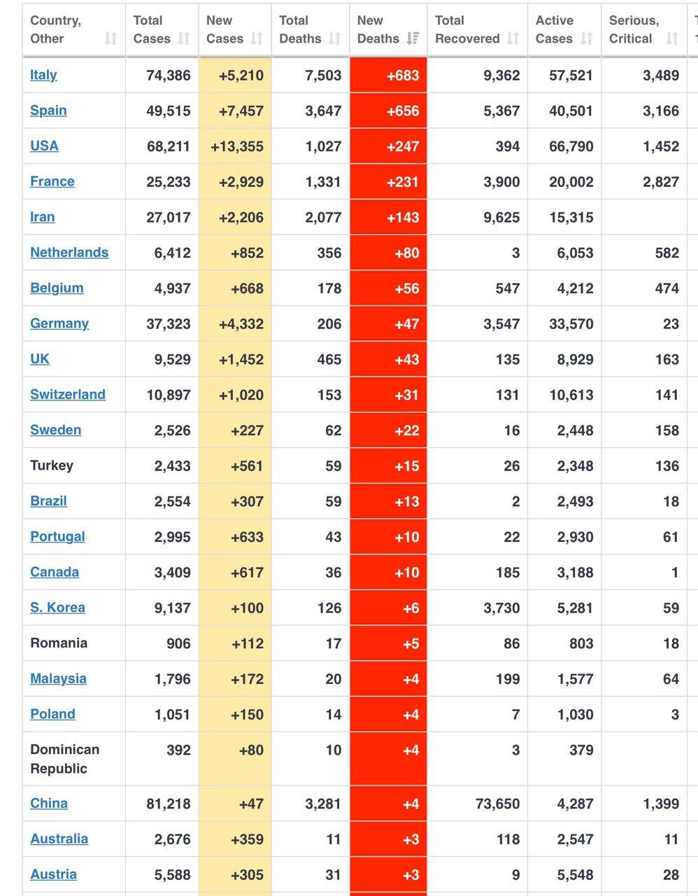 Країнами з найбільш швидким поширенням коронавірусу залишаються Італія (74 386), Сполучені Штати (69 018), які вийшли на третє місце, включаючи Китай, Іспанія (49 515), Німеччина (37 323) та Іран (27 017).