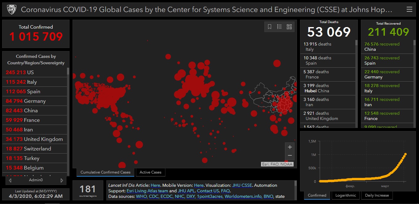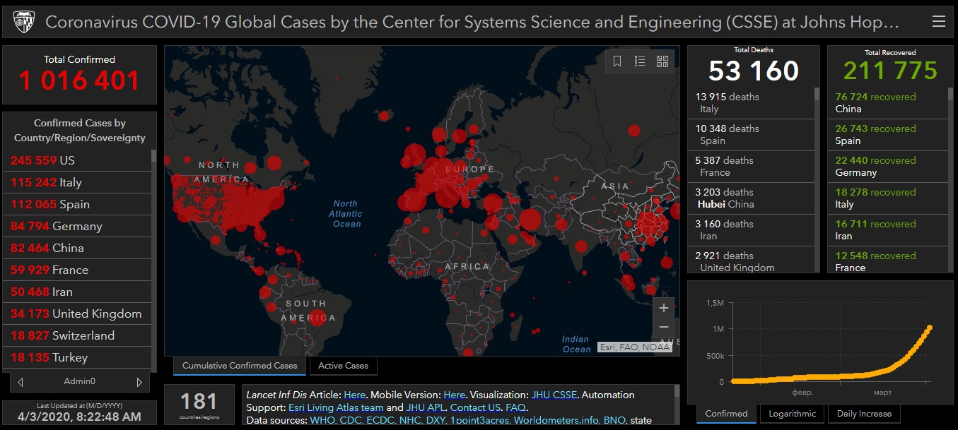 Станом на 09:00 у світі вже 1 016 401 людина інфікована коронавірусом. З них померли 53 160. Одужали – 211 775.