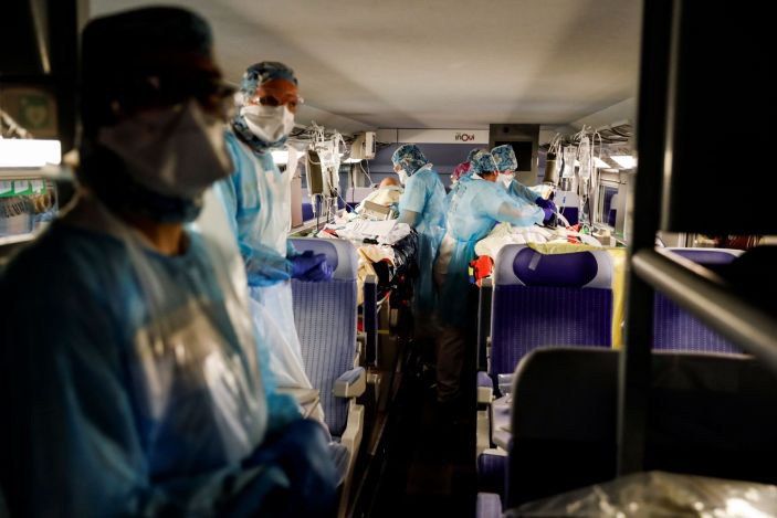 19:02 ФРАНЦІЯ. На залізниці почали використовувати спеціальні санітарні поїзди - це двоповерхові рухомі склади. У кожному вагоні на першому поверсі розміщуються чотири ноші з пацієнтами. Другий поверх використовується для персоналу.