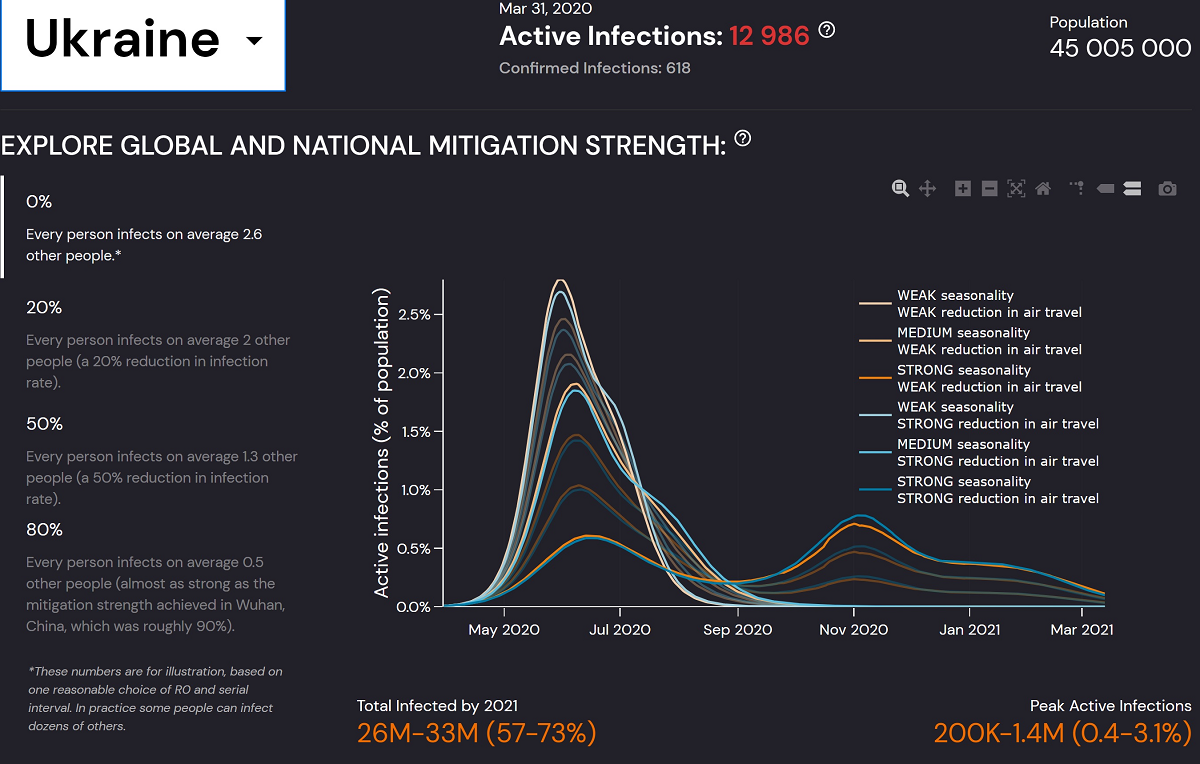 Цифри опубліковано станом на 31 березня. Офіційно в Україні станом на 31 березня було зареєстровано 618 осіб хворих на коронавірус. Вчені моделювали ситуацію, беручи до уваги те, що в країні проживає 45 млн осіб.