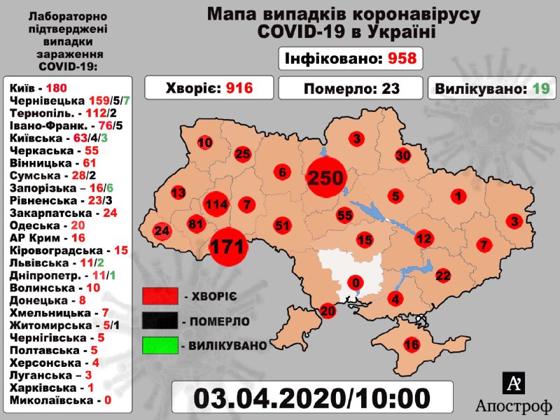 Станом на вечір 3 квітня в Україні зафіксовано 1072 випадки. Померли 27 людей, а одужали - 23.